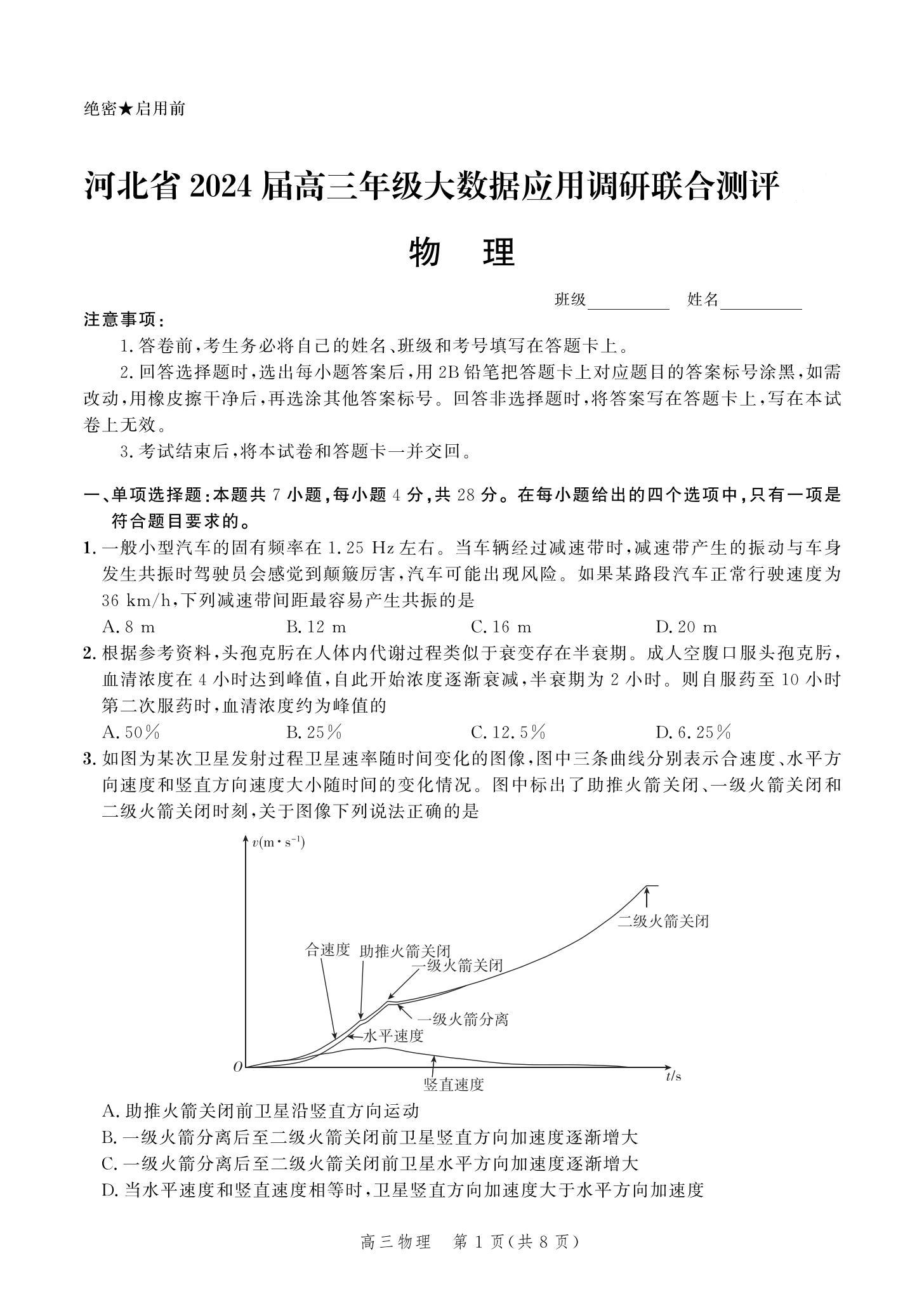 河北省2024届高三大数据应用调研联合测评(Ⅵ)物理
