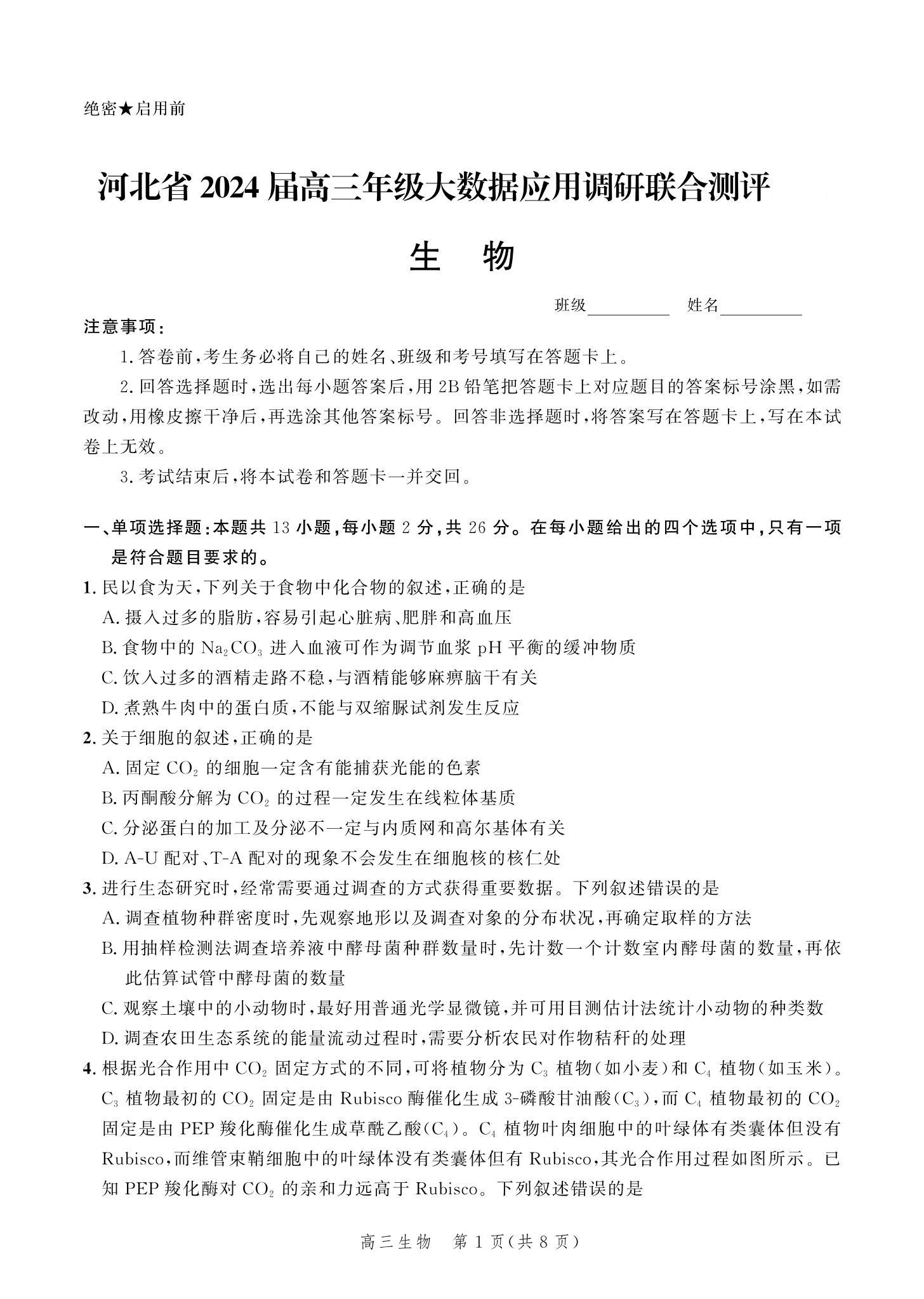 河北省2024届高三大数据应用调研联合测评(Ⅵ)生物