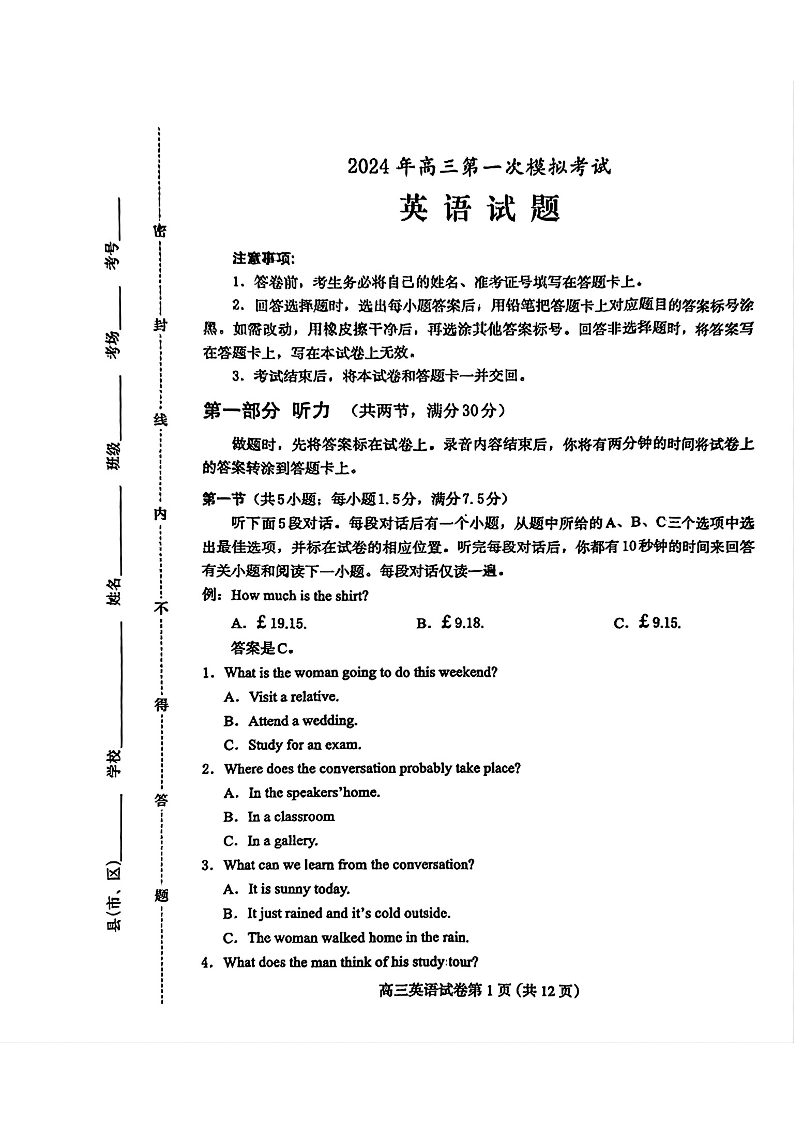 河北省保定邢台市2024年高三第一次模拟考试(保定邢台一模)英语