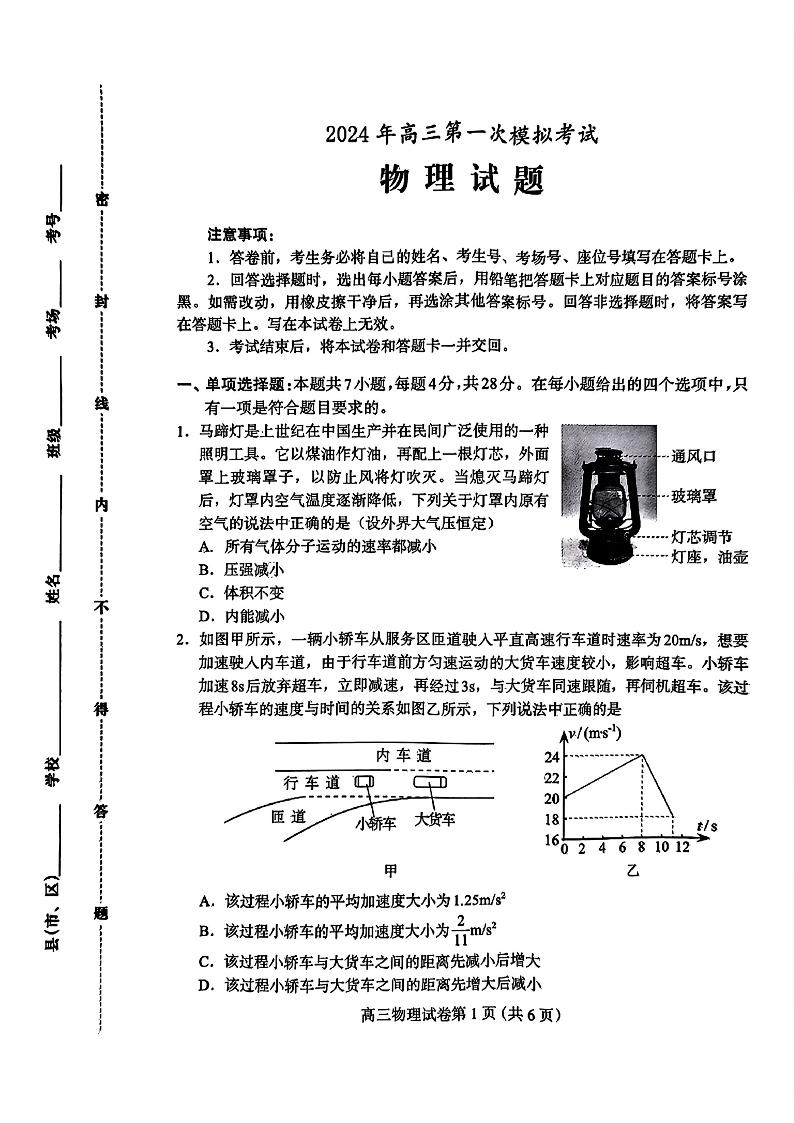 河北省保定邢台市2024年高三第一次模拟考试(保定邢台一模)物理