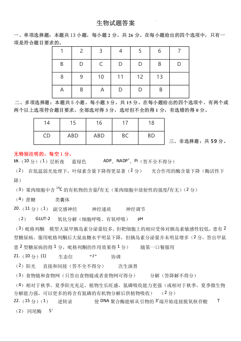 河北省保定邢台市2024年高三第一次模拟考试(保定邢台一模)生物答案