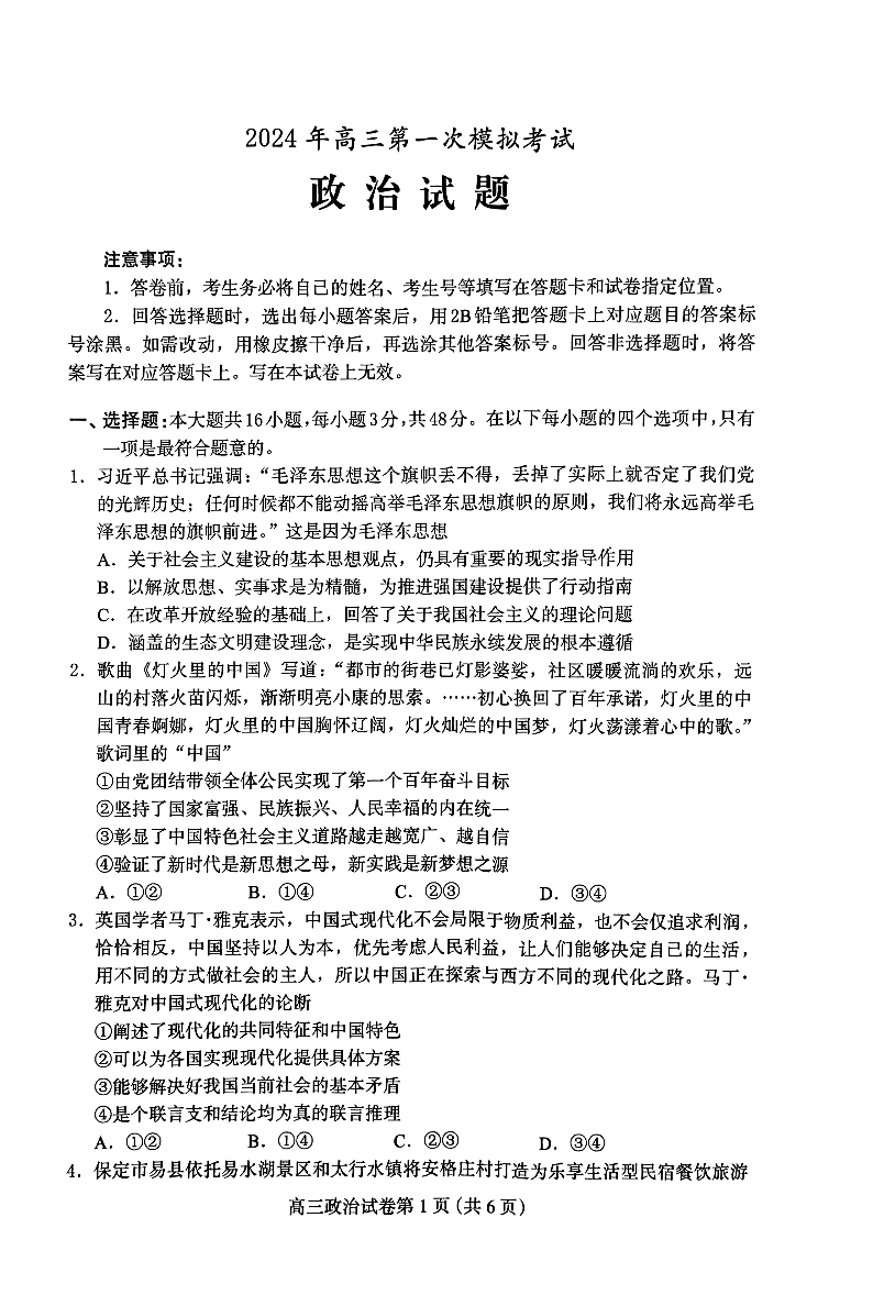 河北省保定邢台市2024年高三第一次模拟考试(保定邢台一模)政治