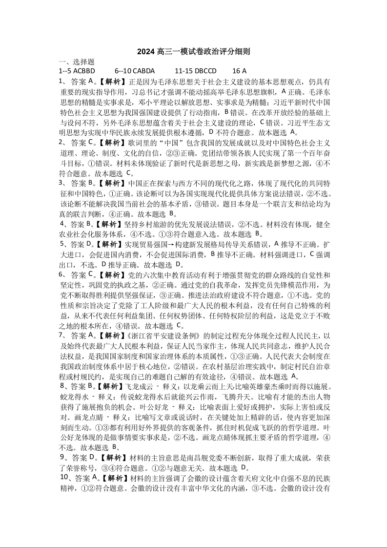 河北省保定邢台市2024年高三第一次模拟考试(保定邢台一模)政治答案