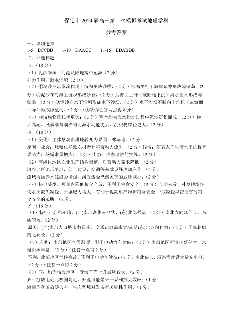 河北省保定邢台市2024年高三第一次模拟考试(保定邢台一模)地理答案