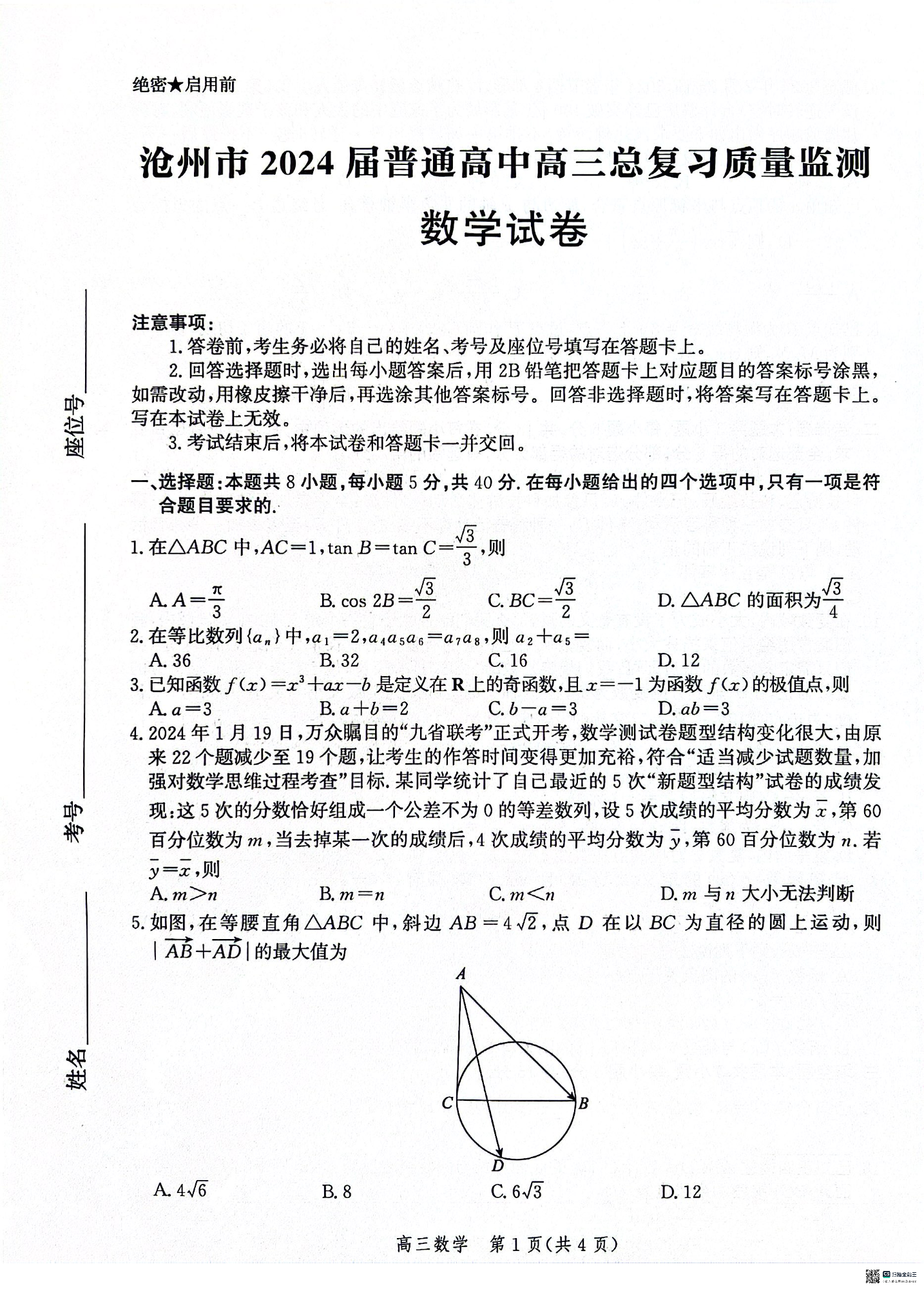 河北省沧州市2024届普通高中高三总复习质量监测(二模)数学+答案