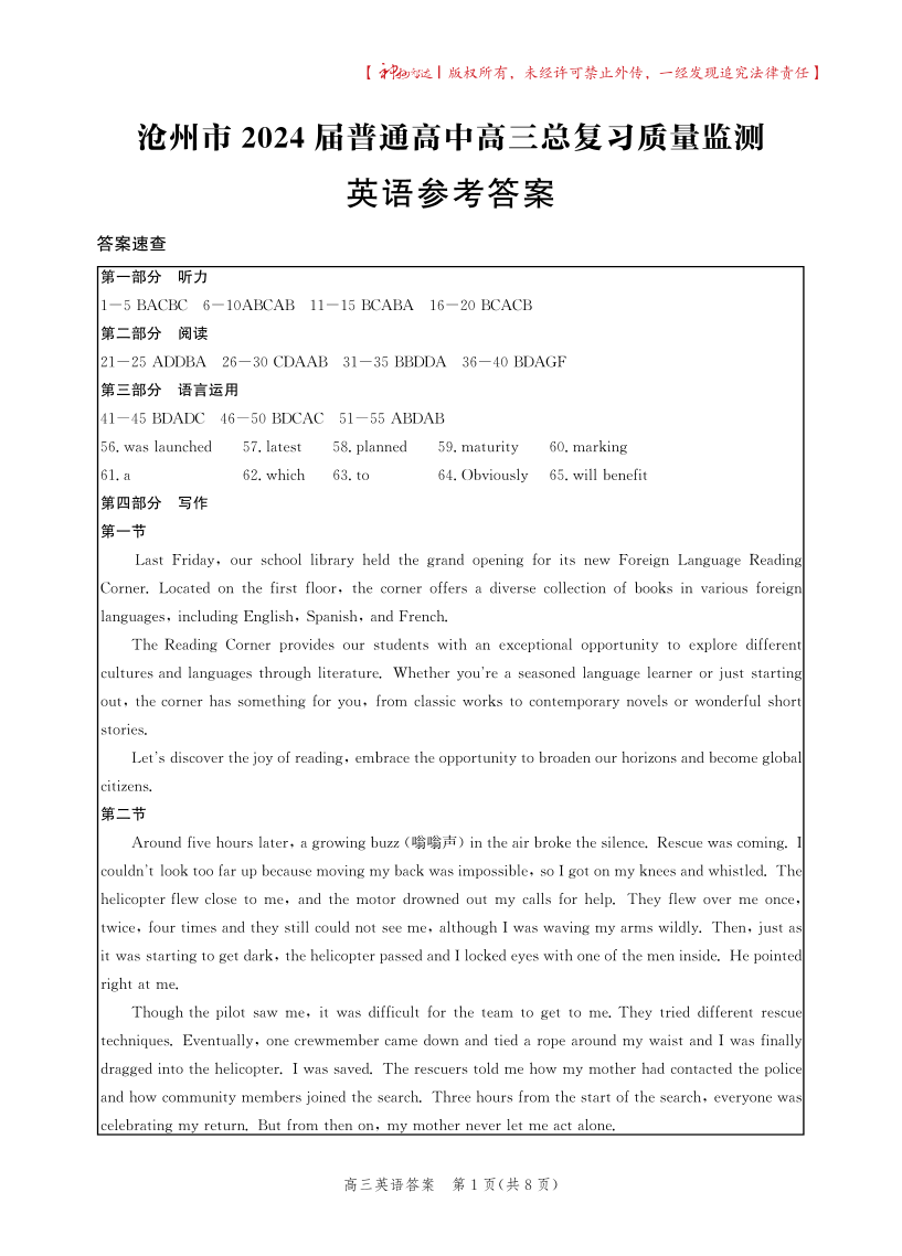 河北省沧州市2024届普通高中高三总复习质量监测(二模)英语答案