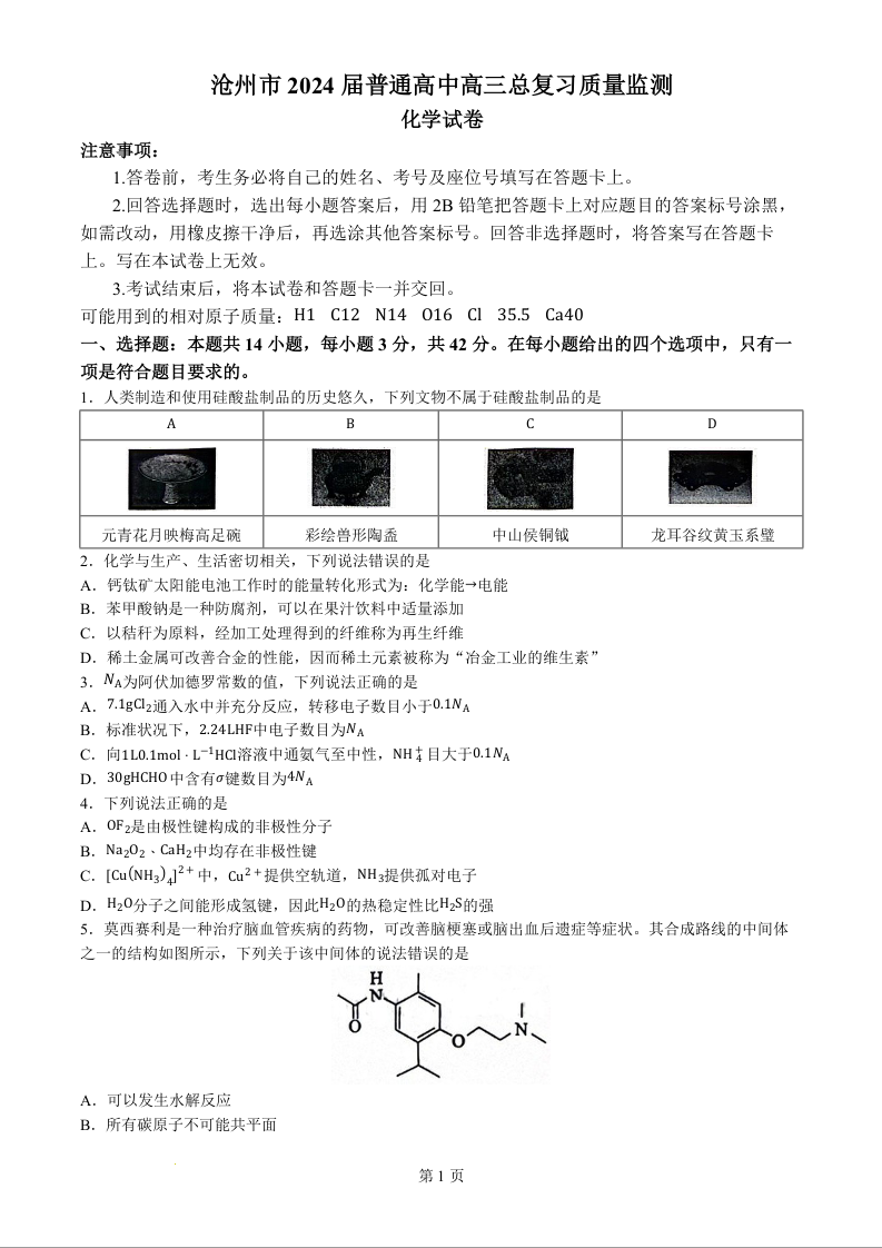 河北省沧州市2024届普通高中高三总复习质量监测(二模)化学