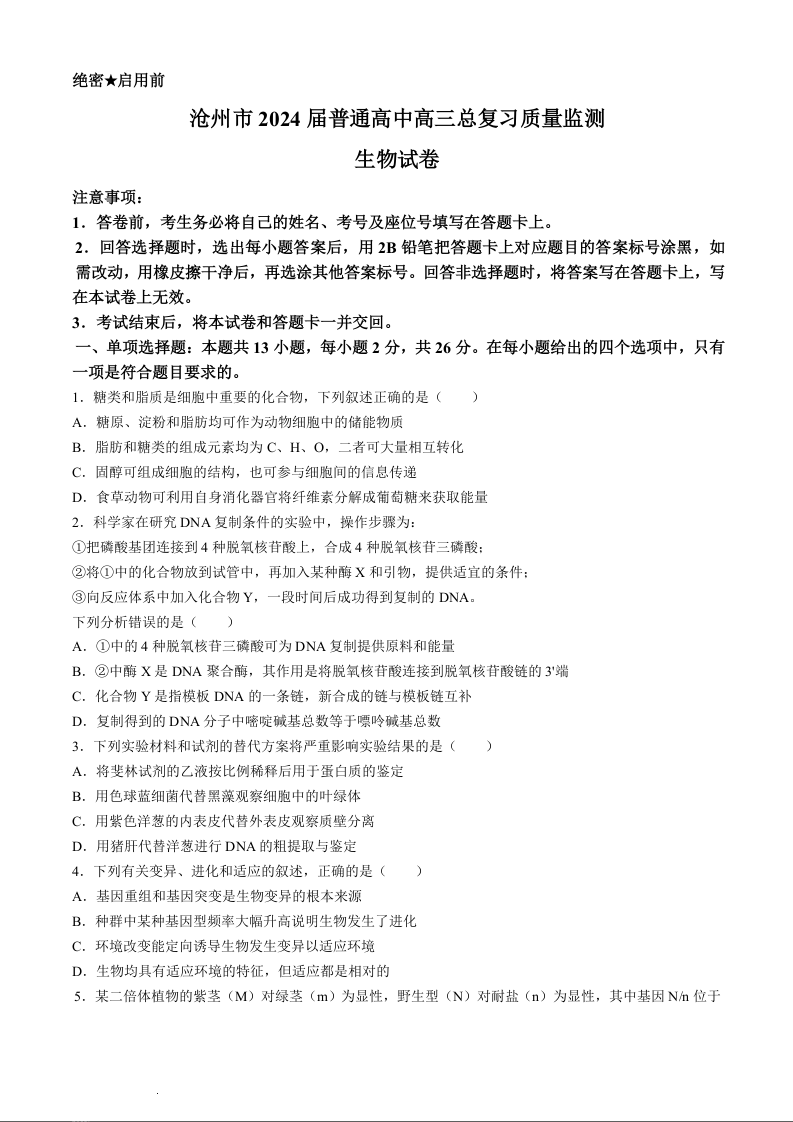 河北省沧州市2024届普通高中高三总复习质量监测(二模)生物+答案