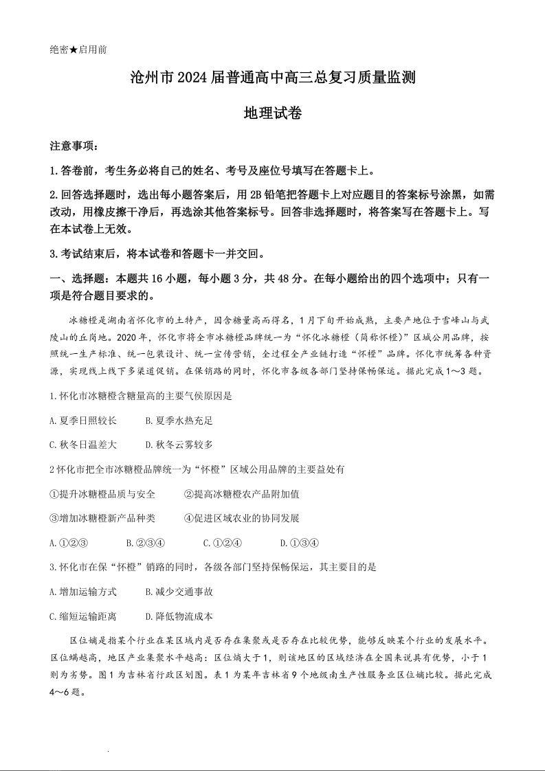 河北省沧州市2024届普通高中高三总复习质量监测(二模)地理+答案