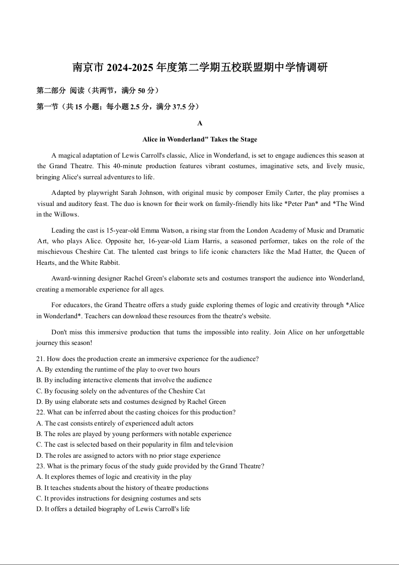 江苏省南京市五校联盟2024-2025学年高二下学期期中考试英语+答案