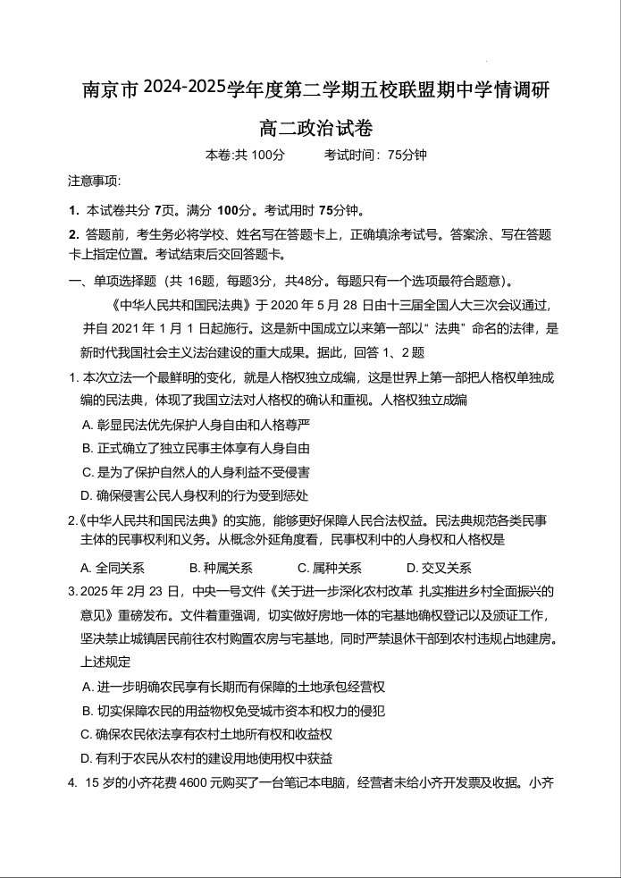 江苏省南京市五校联盟2024-2025学年高二下学期期中考试政治+答案
