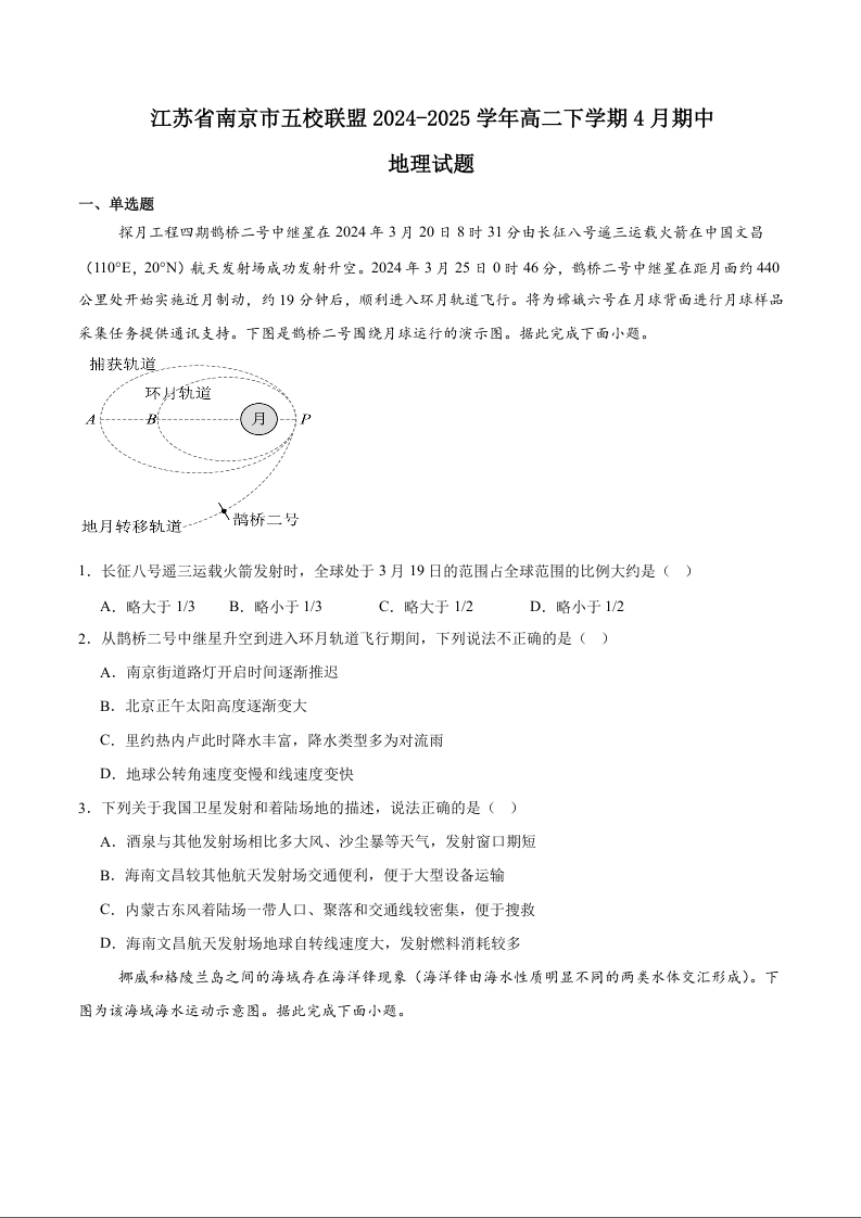 江苏省南京市五校联盟2024-2025学年高二下学期期中考试地理+答案