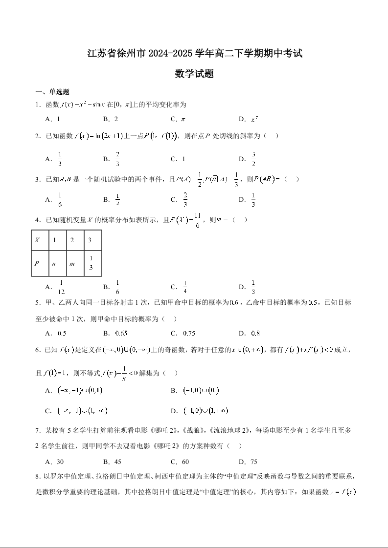 江苏省徐州市2024-2025学年高二下学期期中考试数学+答案