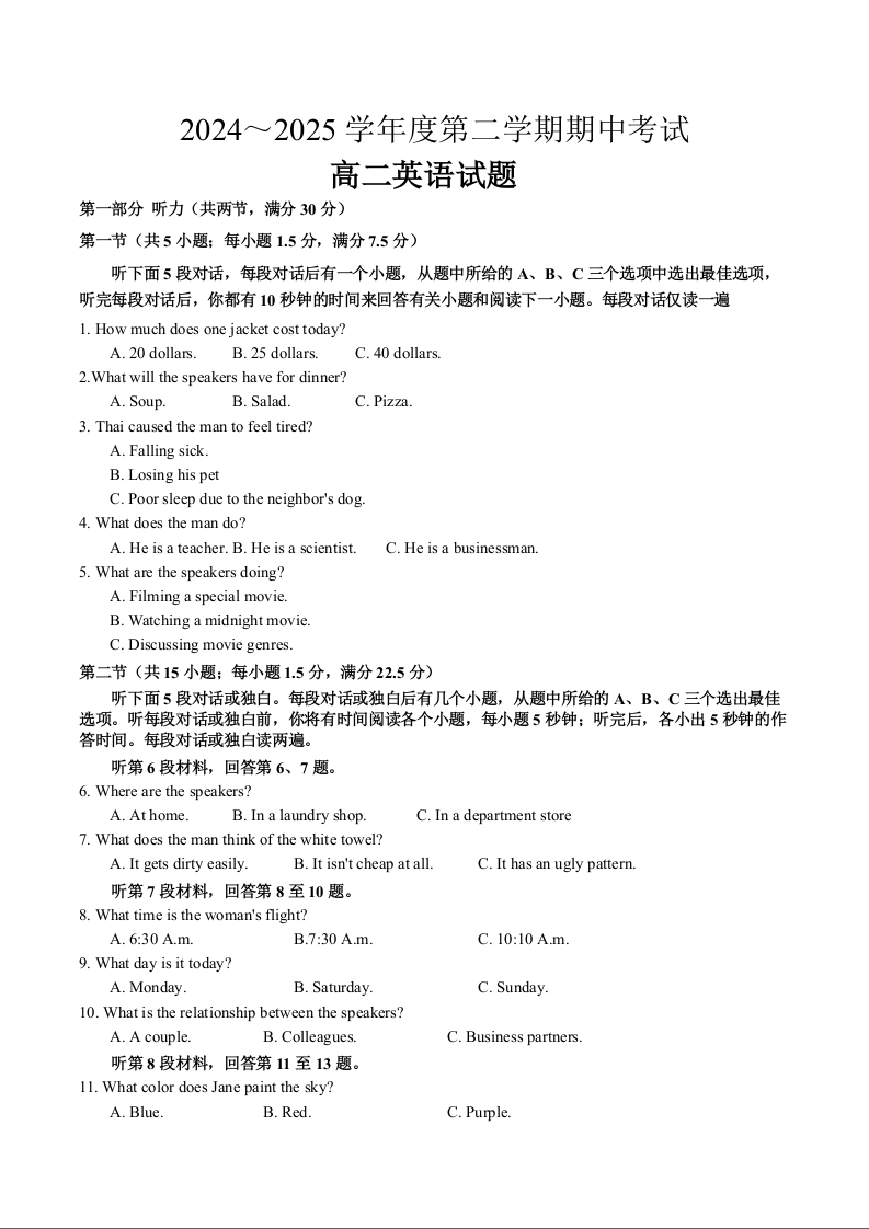江苏省徐州市2024-2025学年高二下学期期中考试英语+答案