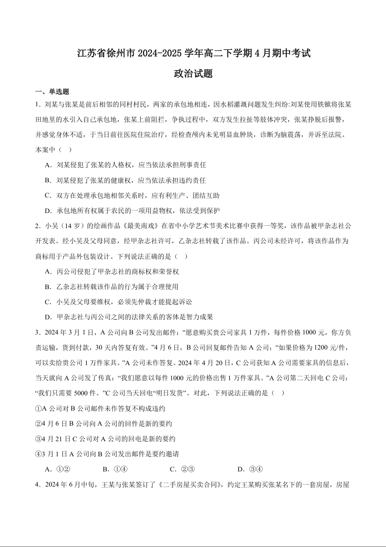 江苏省徐州市2024-2025学年高二下学期期中考试政治+答案