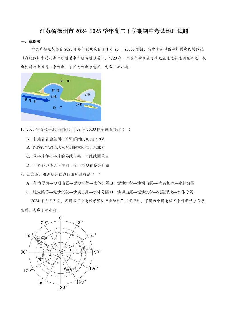 江苏省徐州市2024-2025学年高二下学期期中考试地理+答案