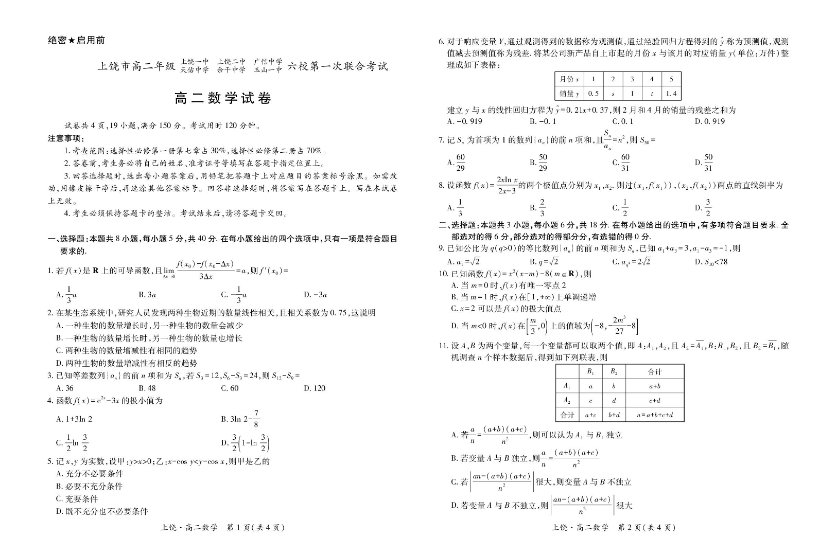 江西省上饶市六校2024-2025学年高二下学期5月第一次联合考试数学
