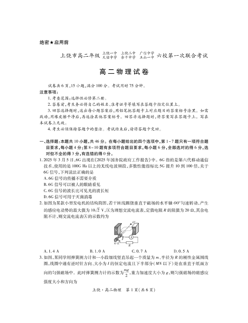 江西省上饶市六校2024-2025学年高二下学期5月第一次联合考试物理+答案