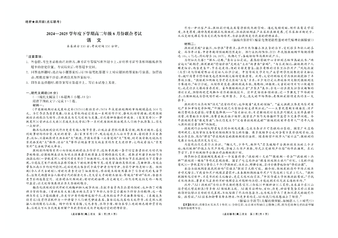 辽宁省点石联考2024-2025高二下学期6月考试语文+答案