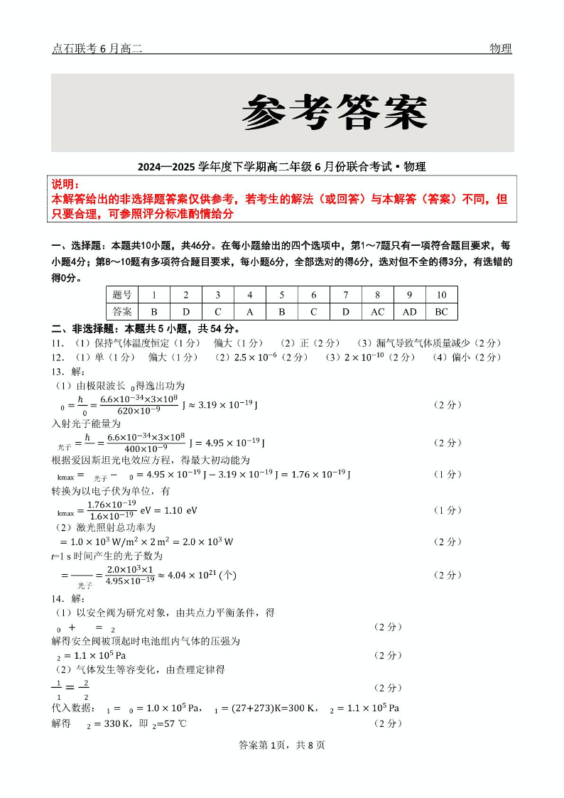 辽宁省点石联考2024-2025高二下学期6月考试物理答案