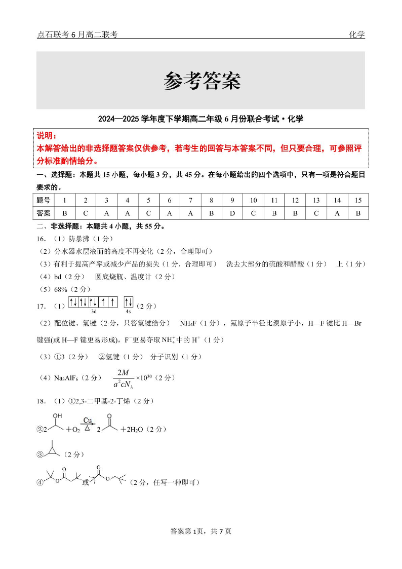 辽宁省点石联考2024-2025高二下学期6月考试化学答案