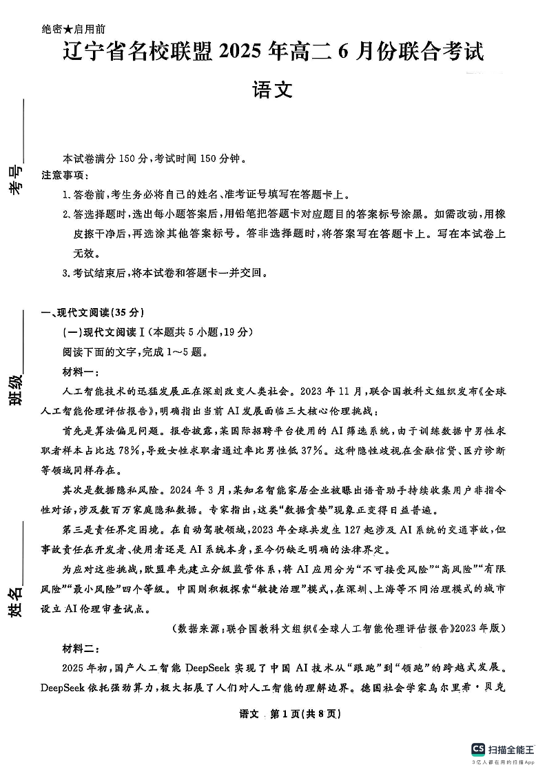 辽宁省名校联盟2024-2025学年高二下学期6月份联合考试语文+答案