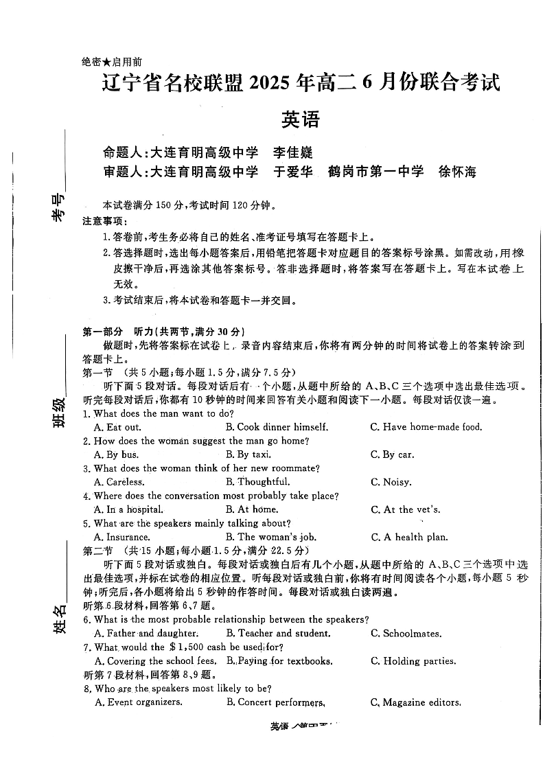 辽宁省名校联盟2024-2025学年高二下学期6月份联合考试英语+答案