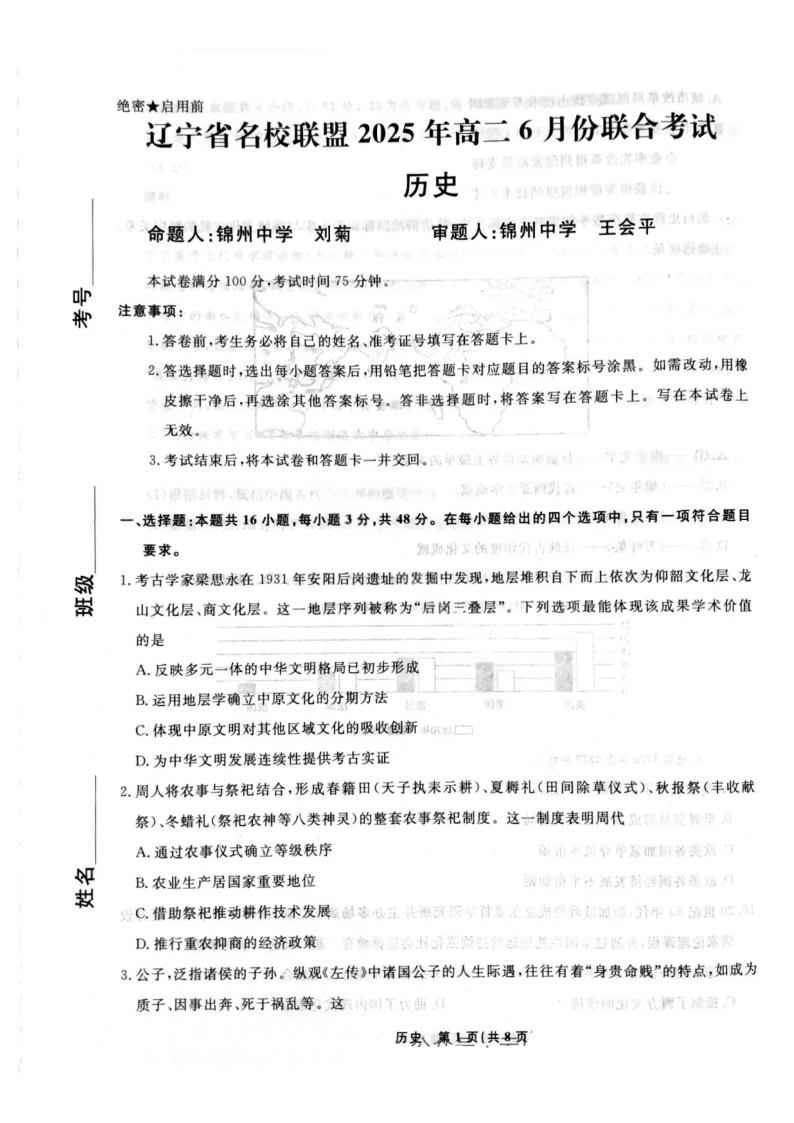 辽宁省名校联盟2024-2025学年高二下学期6月份联合考试历史+答案