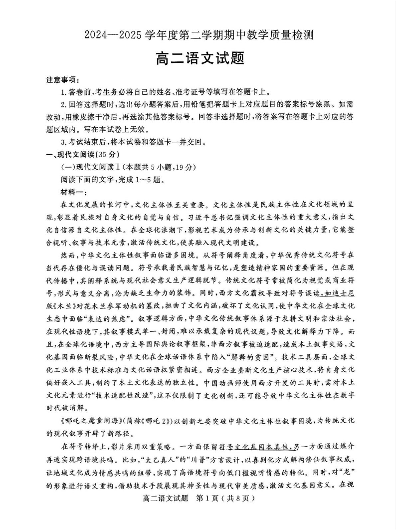 山东省聊城市2024-2025学年高二下学期期中考试语文+答案
