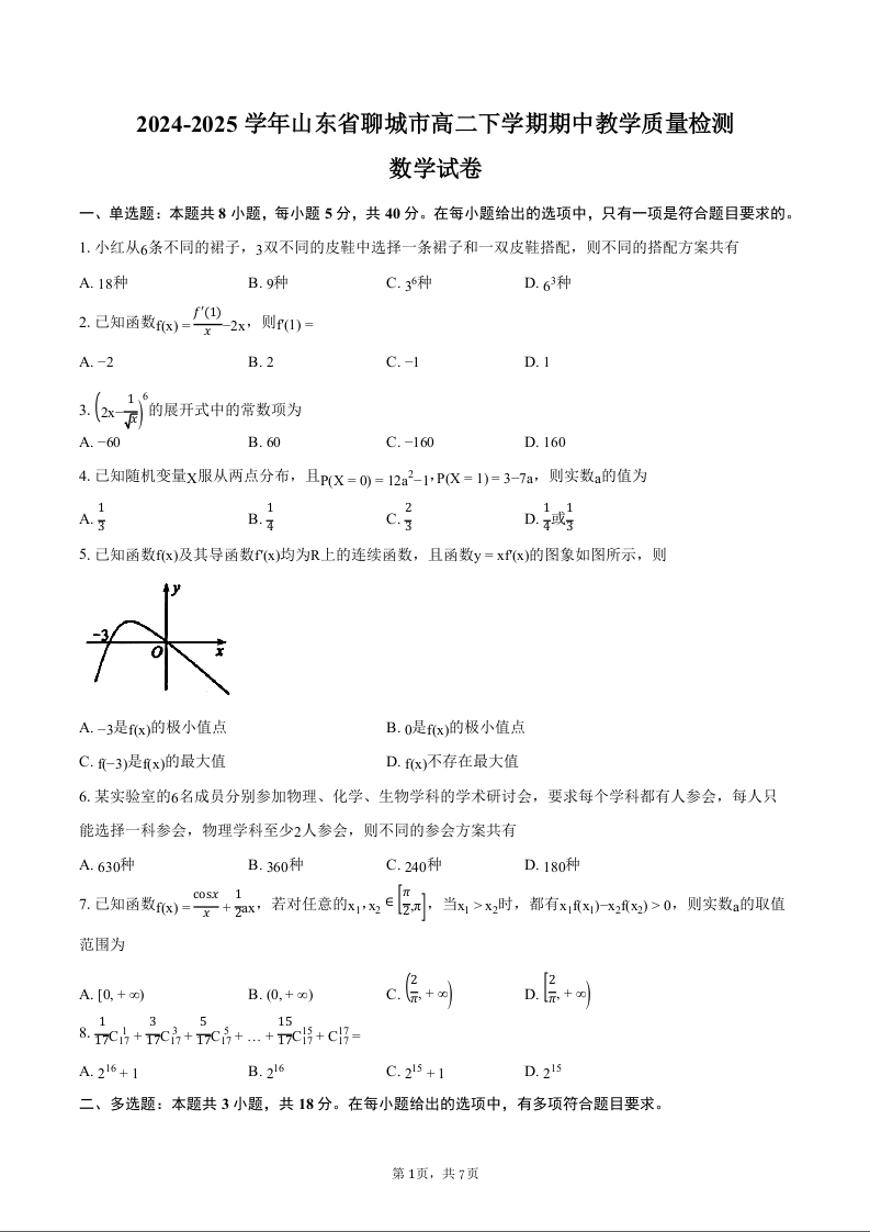 山东省聊城市2024-2025学年高二下学期期中考试数学+答案
