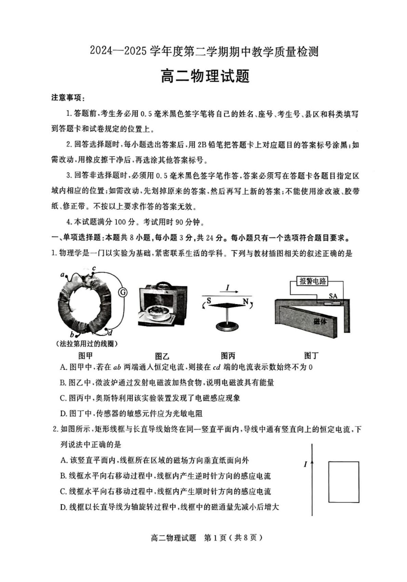 山东省聊城市2024-2025学年高二下学期期中考试物理+答案