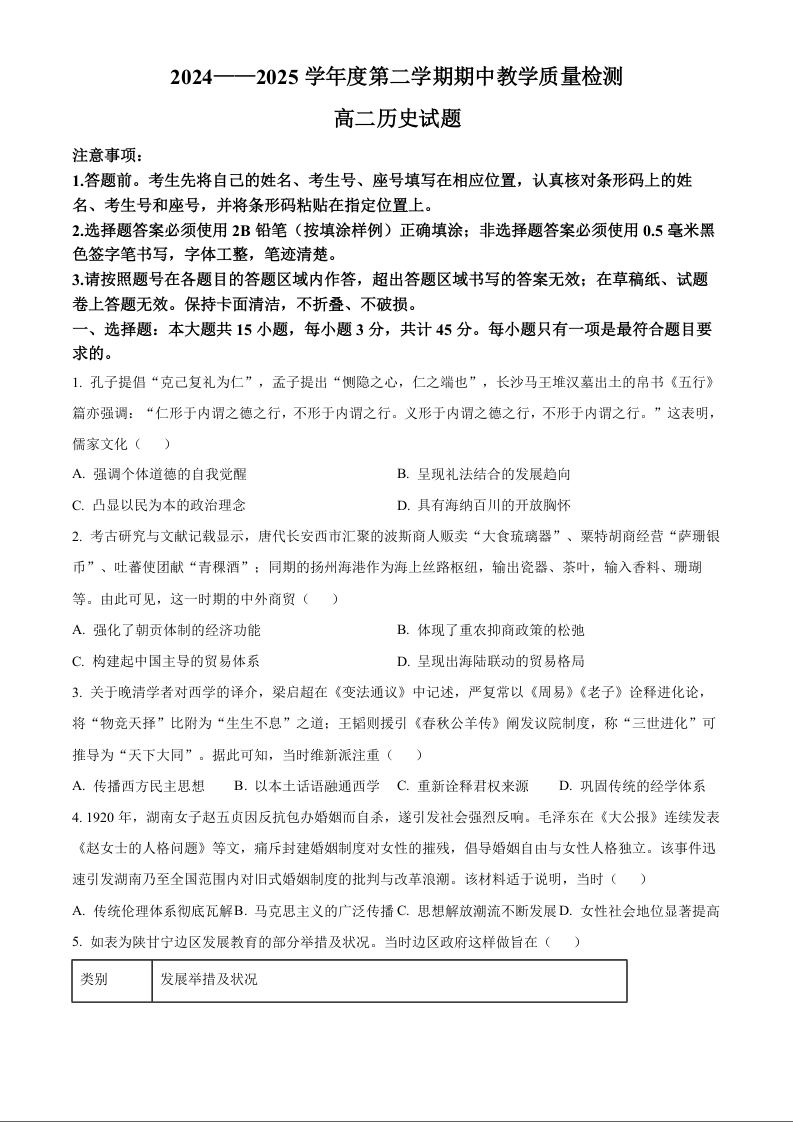 山东省聊城市2024-2025学年高二下学期期中考试历史+答案