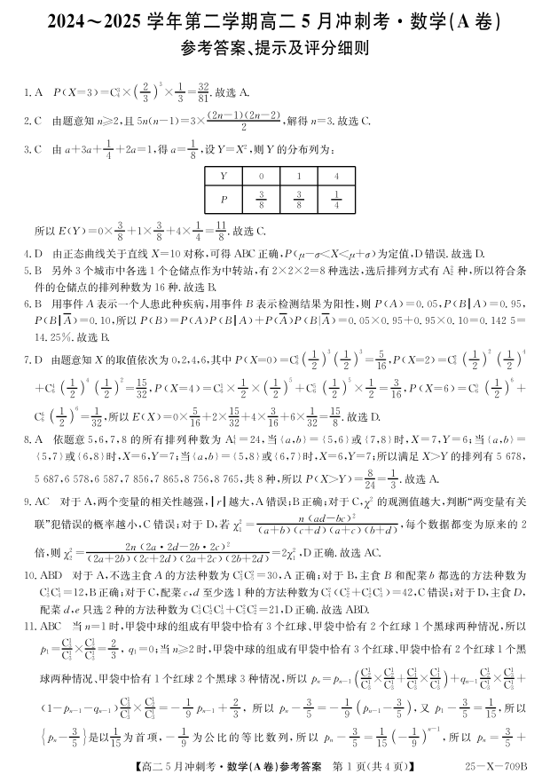 山西省卓越联盟2024-2025学年高二下学期5月冲刺考试数学(A卷)答案