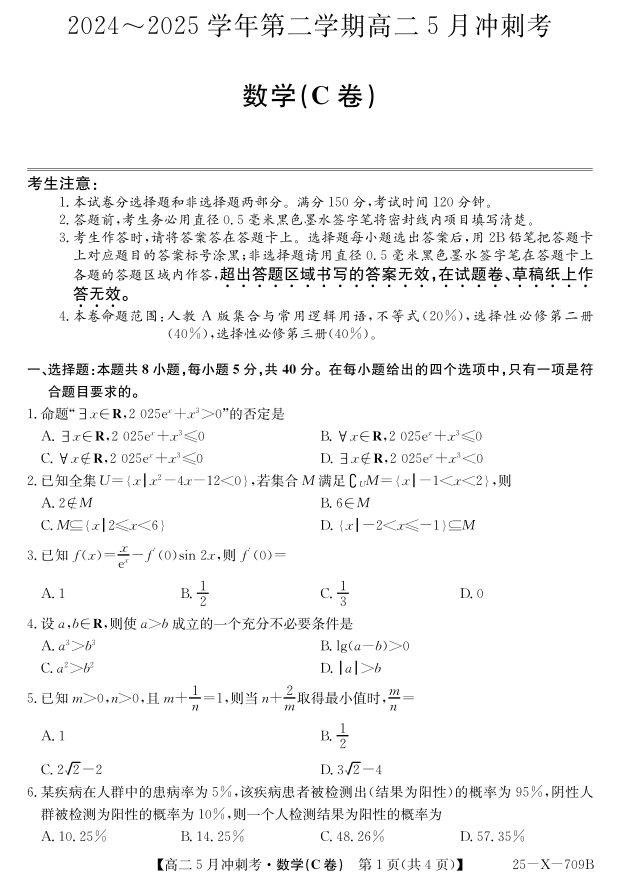 山西省卓越联盟2024-2025学年高二下学期5月冲刺考试数学(C卷)