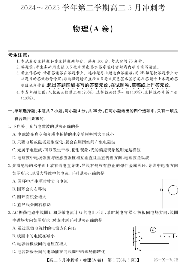 山西省卓越联盟2024-2025学年高二下学期5月冲刺考试物理(A卷)
