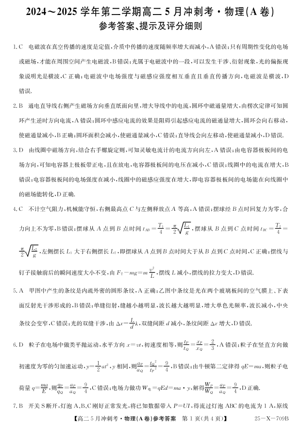 山西省卓越联盟2024-2025学年高二下学期5月冲刺考试物理(A卷)答案