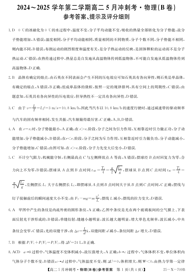山西省卓越联盟2024-2025学年高二下学期5月冲刺考试物理(B卷)答案