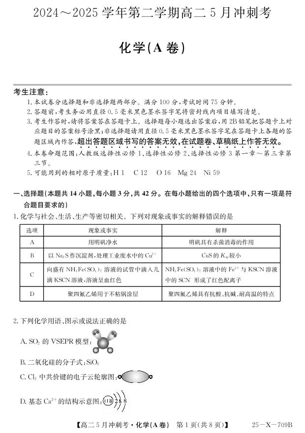 山西省卓越联盟2024-2025学年高二下学期5月冲刺考试化学(A卷)