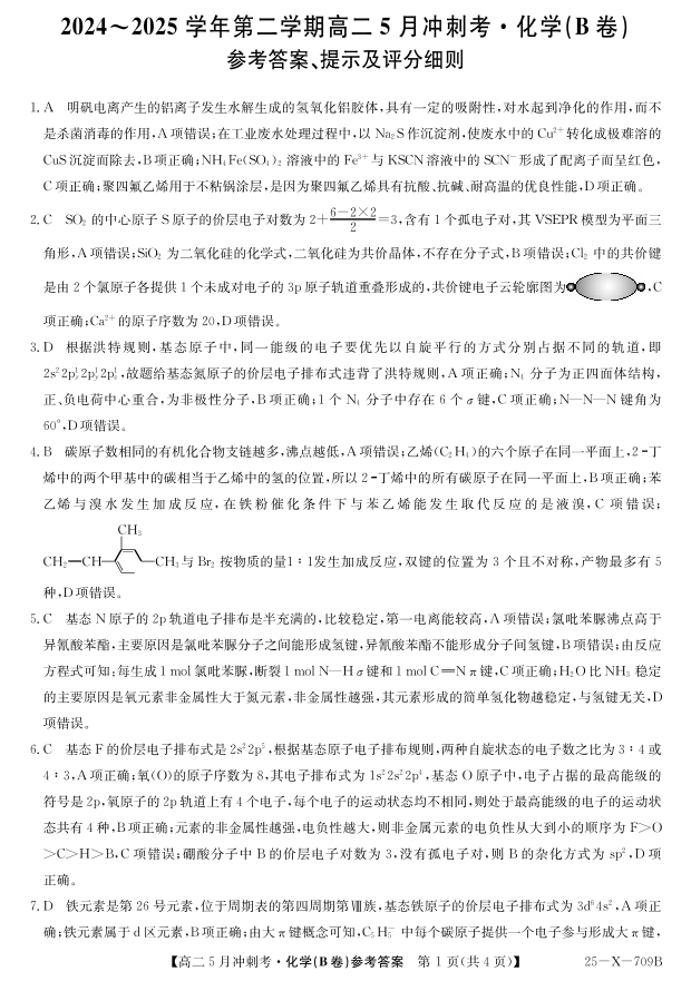 山西省卓越联盟2024-2025学年高二下学期5月冲刺考试化学(B卷)答案