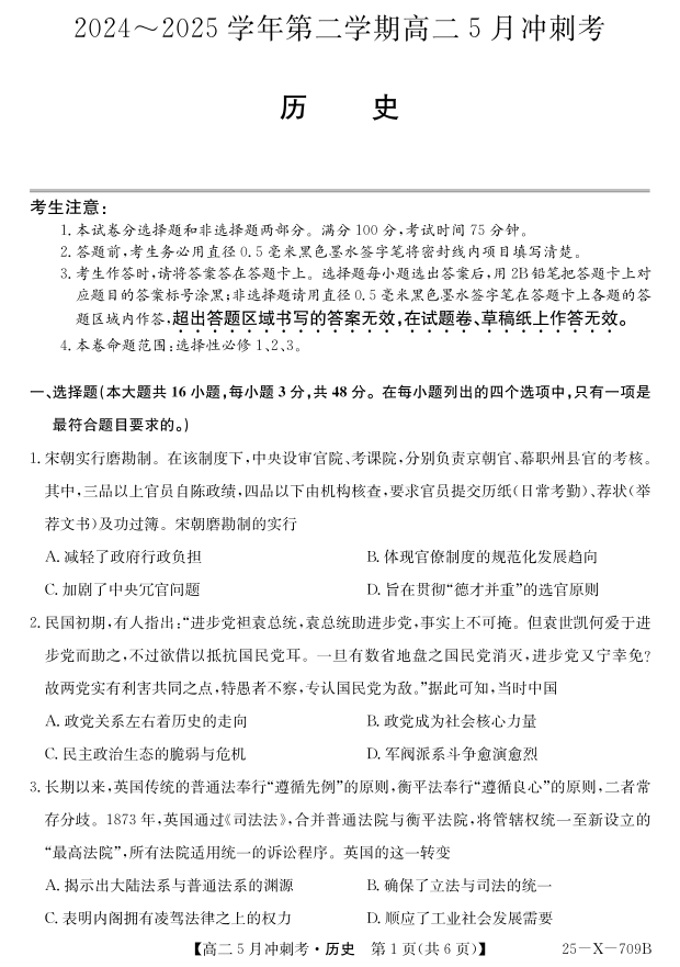 山西省卓越联盟2024-2025学年高二下学期5月冲刺考试历史