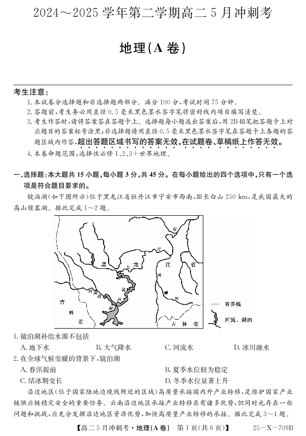 山西省卓越联盟2024-2025学年高二下学期5月冲刺考试地理(A)