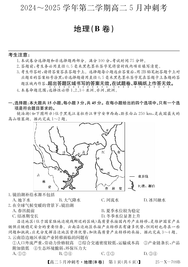 山西省卓越联盟2024-2025学年高二下学期5月冲刺考试地理(B)