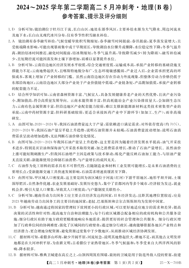 山西省卓越联盟2024-2025学年高二下学期5月冲刺考试地理(B)答案