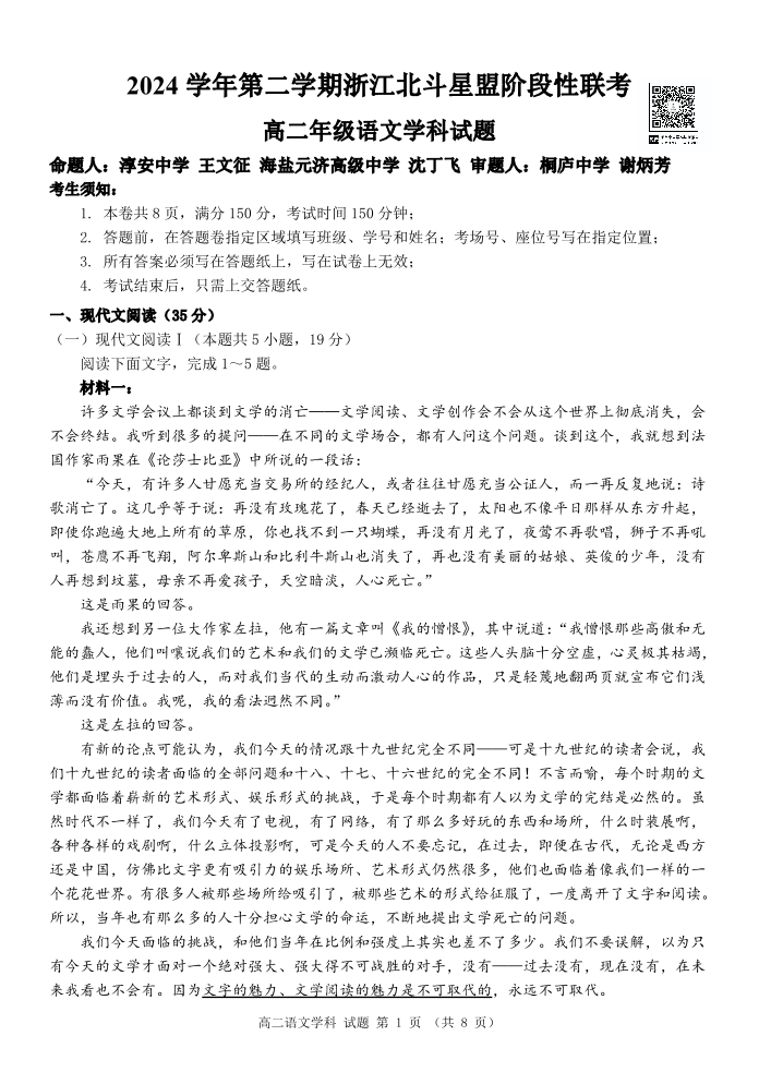 浙江省北斗星盟2024-2025学年高二下学期阶段性联考语文