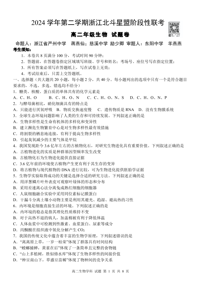 浙江省北斗星盟2024-2025学年高二下学期阶段性联考生物