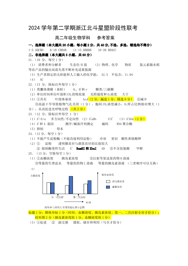 浙江省北斗星盟2024-2025学年高二下学期阶段性联考生物答案