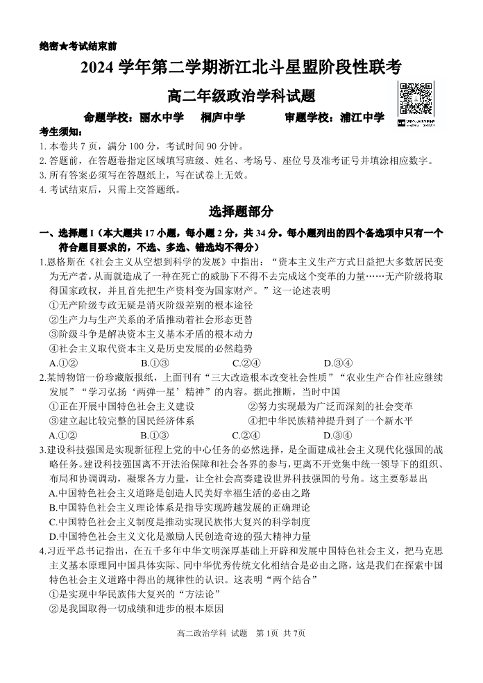 浙江省北斗星盟2024-2025学年高二下学期阶段性联考政治
