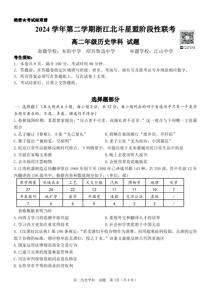 浙江省北斗星盟2024-2025学年高二下学期阶段性联考历史