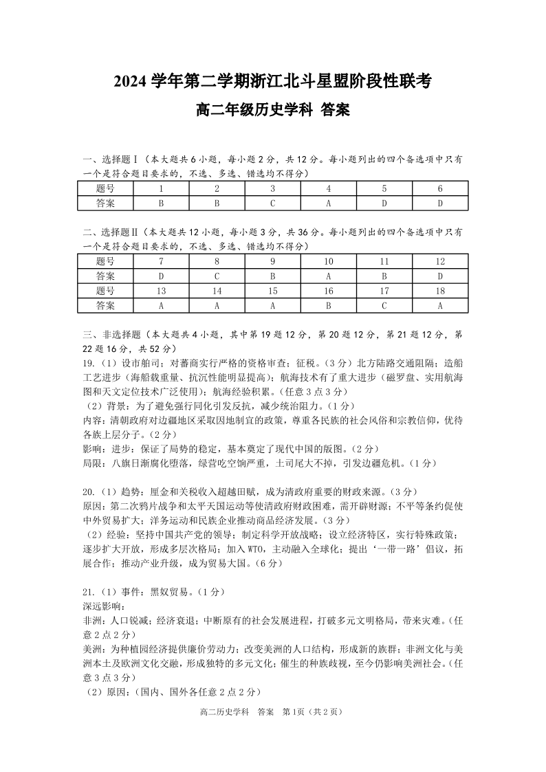 浙江省北斗星盟2024-2025学年高二下学期阶段性联考历史答案