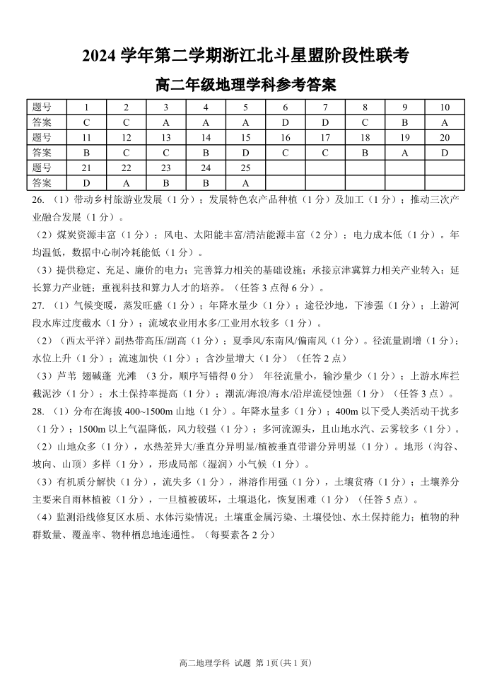 浙江省北斗星盟2024-2025学年高二下学期阶段性联考地理答案